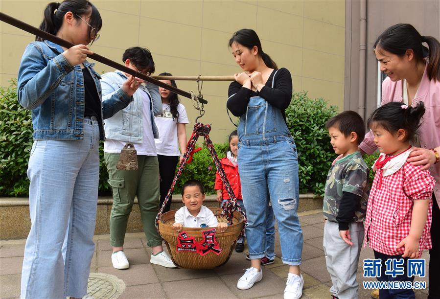 5月5日,江苏省无锡市一家幼儿园的老师用传统方式给小朋友称重。 立夏节气将至,人们参加绘彩蛋、称体重等活动,体验传统民俗。 新华社发(还月亮 摄)