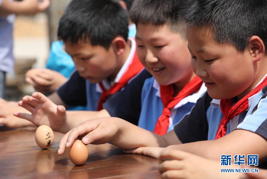 5月5日,在浙江杭州临安区天目山镇武山村,几名小学生在体验“立蛋”的传统习俗。立夏节气将至,人们参加绘彩蛋、称体重等活动,体验传统民俗。新华社发(胡剑欢 摄)