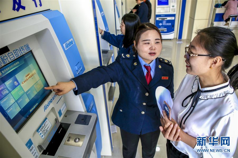 5月6日,在河北省饶阳县涉税分中心,导税员指导纳税人利用办税自助服务机办理业务。 新华社记者 李晓果 摄