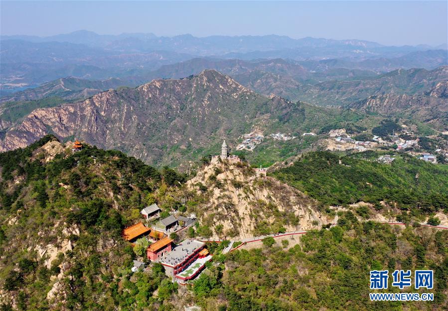 定光佛舍利塔矗立在盘山主峰挂月峰上(5月2日无人机摄)。新华社记者 岳月伟 摄