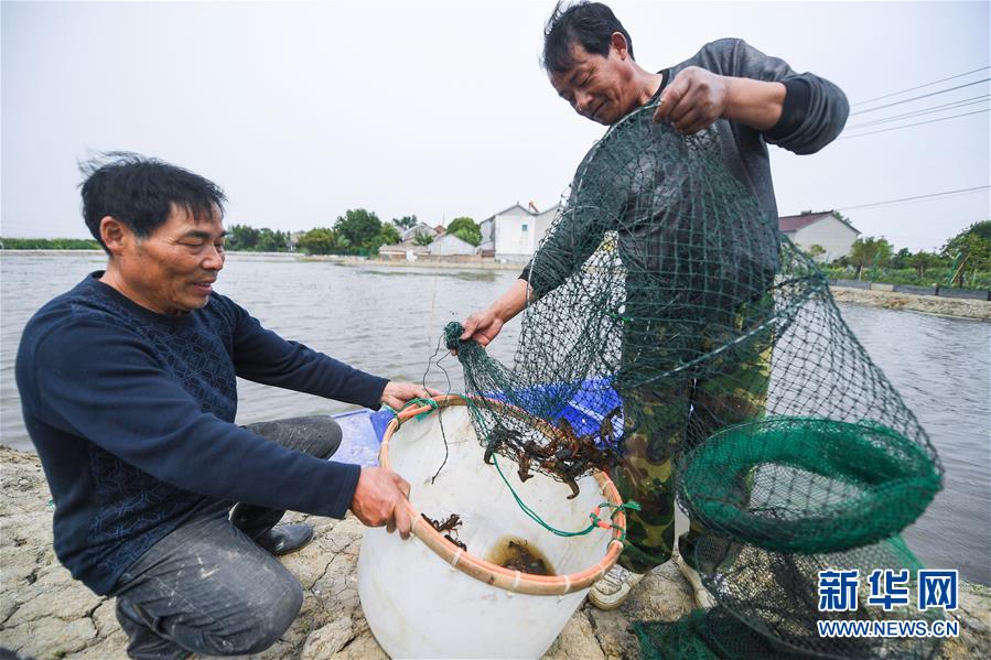 5月6日,东林镇泉益村养殖户在打捞今年第一批养殖的小龙虾。从2018年开始,浙江省湖州市吴兴区东林镇推广稻虾混养、稻鱼共生、种草养蟹、多品种混养等综合种养模式,让养殖户们利用闲置土地进行生态混养,促进“一水多用、一田多收、渔粮共赢”,助力农民增产增收。新华社记者 徐昱 摄