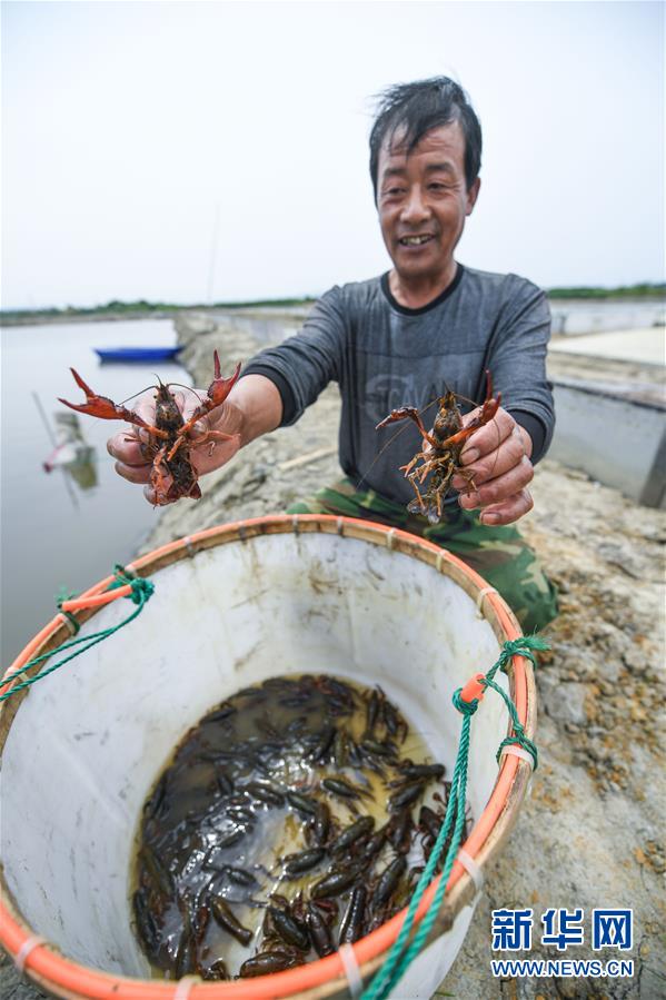 5月6日,东林镇泉益村养殖户展示今年第一批准备上市的小龙虾。从2018年开始,浙江省湖州市吴兴区东林镇推广稻虾混养、稻鱼共生、种草养蟹、多品种混养等综合种养模式,让养殖户们利用闲置土地进行生态混养,促进“一水多用、一田多收、渔粮共赢”,助力农民增产增收。新华社记者 徐昱 摄