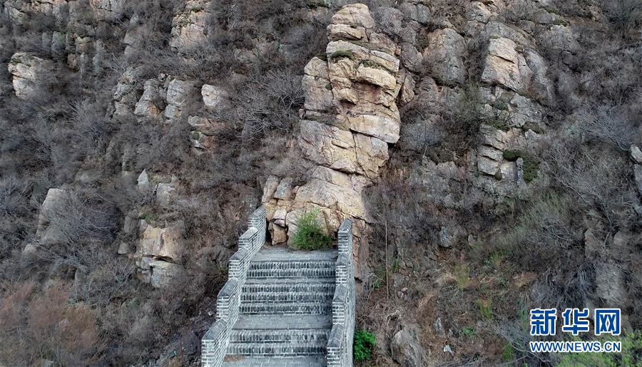 黄崖关长城东侧的起点与陡峭的山崖相连(4月18日摄)。新华社记者 岳月伟 摄