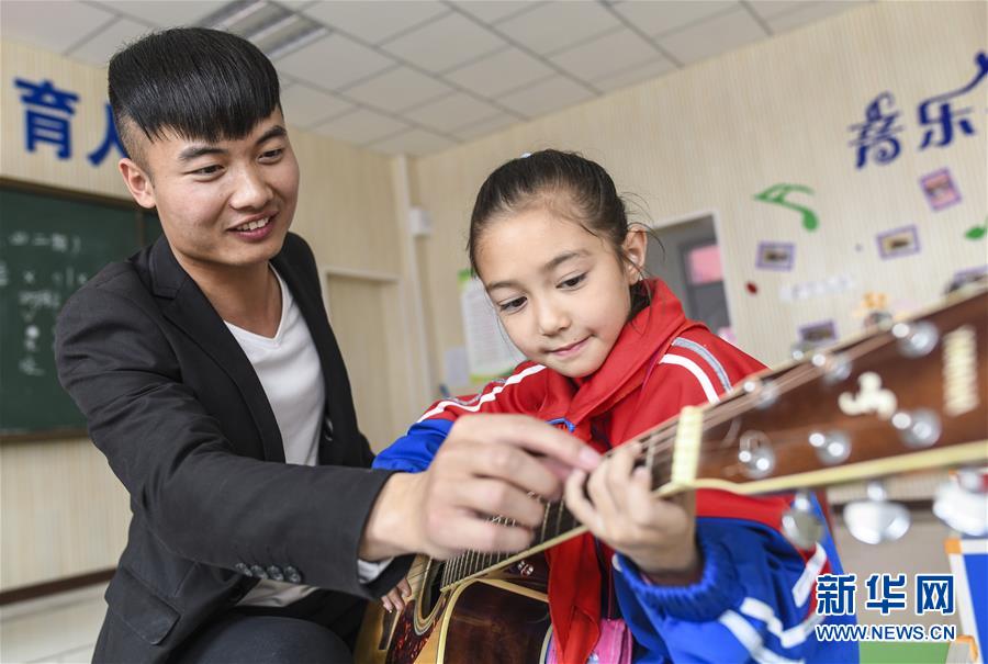 在新疆且末县第二小学,史兴林(左)在教学生祖丽阿娅弹吉他(4月18日摄)。新华社记者 王菲 摄