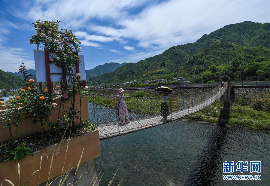 5月7日,游客在新峰村玫瑰园的吊桥上拍照。 2019年初,浙江省杭州市临安区清凉峰镇新峰村的村民通过众筹的方式,建成并对外开放了占地面积200多亩的乡村玫瑰园。该玫瑰园的玫瑰品种达到100多种,通过开发玫瑰花盆栽、玫瑰花茶、玫瑰露等玫瑰产品,发展乡村旅游,带动当地村民致富。 新华社记者 徐昱 摄