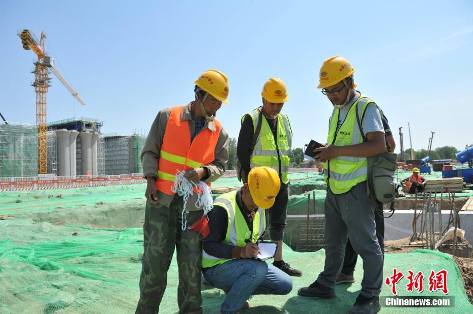 5月7日,京雄城际铁路雄安站的建设工地上,工人们正在紧张有序的进行施工。京雄城际铁路建设工程是国家重点建设项目,连接北京市区、北京新机场和雄安新区的重要轨道交通线。该铁路起自京九铁路李营站,经北京大兴区、北京新机场、霸州市、终至雄安新区。正线全长92.4公里,全线设五座车站。建成通车后,对于促进京津冀协同发展和支撑建设雄安国家级新区具有重要意义。图为工作人员记录测量数据。中新社记者 韩冰 摄