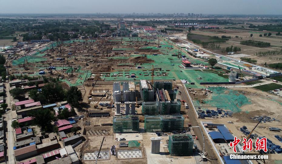 5月7日,航拍京雄城际铁路雄安站施工现场。京雄城际铁路建设工程是国家重点建设项目,连接北京市区、北京新机场和雄安新区的重要轨道交通线。该铁路起自京九铁路李营站,经北京大兴区、北京新机场、霸州市、终至雄安新区。正线全长92.4公里,全线设五座车站。建成通车后,对于促进京津冀协同发展和支撑建设雄安国家级新区具有重要意义。中新社记者 韩冰 摄