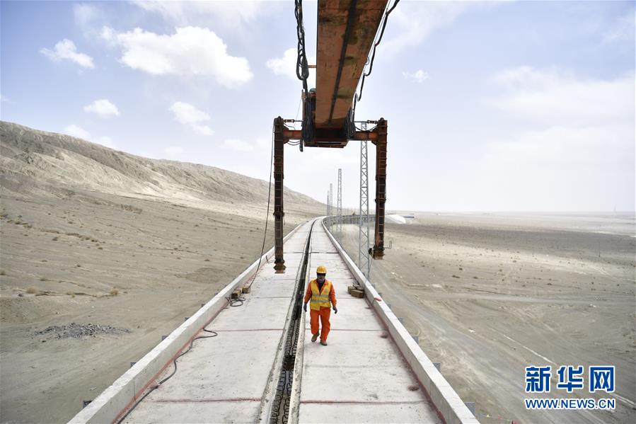 5月7日,中铁二十二局集团施工人员在检查格库铁路茫崖湖2号特大桥桥体。 当日,青海格尔木至新疆库尔勒铁路青海段线下主体工程顺利完工。 全长1214公里的格库铁路是国家重点项目,格库铁路青海段预计今年6月份完成铺轨,铁路全线预计2020年建成通车。 新华社记者 张龙 摄