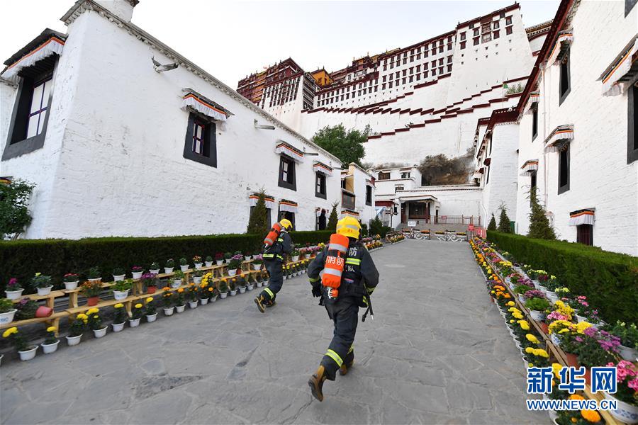 5月7日,消防人员在演练中向假设着火点奔跑。 当日,为提升西藏自治区消防救援队伍处置寺庙文物古建筑火灾能力,检验社会应急联动单位协同作战机制,拉萨市消防救援支队在布达拉宫举行寺庙文物古建筑火灾扑救实战演练。 新华社记者 李鑫 摄