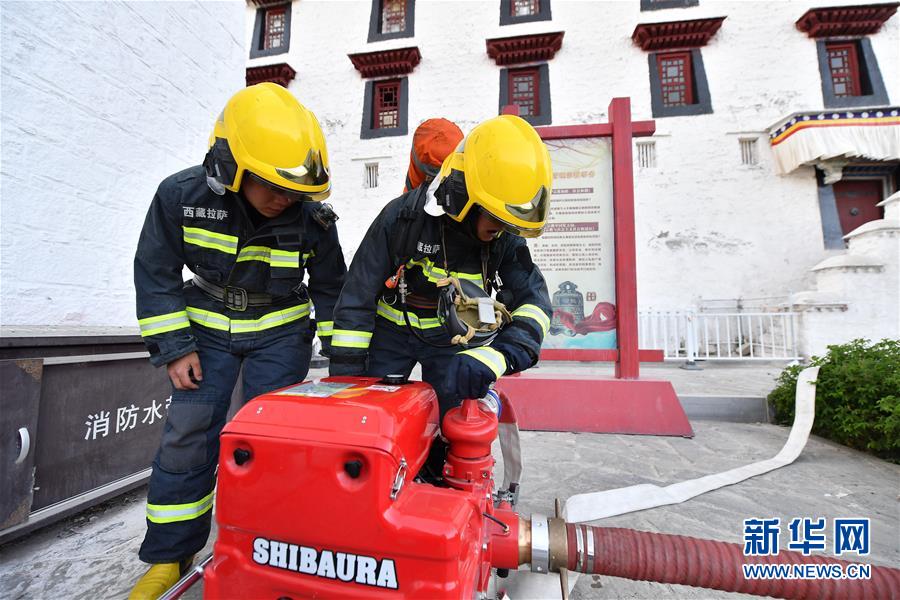 5月7日,消防员在布达拉宫一处水池旁用抽水泵取水。 当日,为提升西藏自治区消防救援队伍处置寺庙文物古建筑火灾能力,检验社会应急联动单位协同作战机制,拉萨市消防救援支队在布达拉宫举行寺庙文物古建筑火灾扑救实战演练。 新华社记者 李鑫 摄