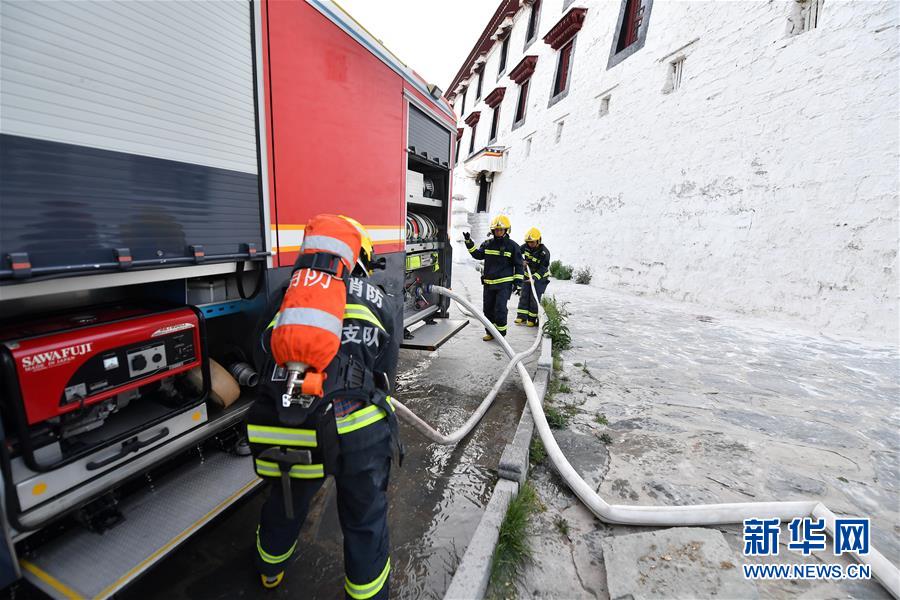 5月7日,消防人员将消防水带与消防车连接。 当日,为提升西藏自治区消防救援队伍处置寺庙文物古建筑火灾能力,检验社会应急联动单位协同作战机制,拉萨市消防救援支队在布达拉宫举行寺庙文物古建筑火灾扑救实战演练。 新华社记者 李鑫 摄