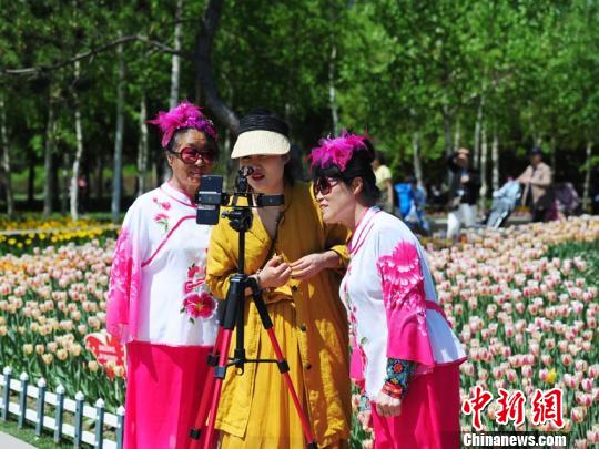 百万余株郁金香竞相盛开,吸引大批市民前来赏花。 刘栋 摄