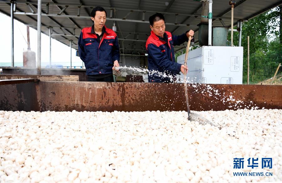 5月7日,邓伟(左)和村民在食用菌种植基地内清洗双孢菇。 新华社记者刘军喜摄