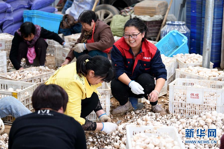 5月7日,欧明艳在食用菌种植基地内和村民一起分拣双孢菇。 新华社记者刘军喜摄