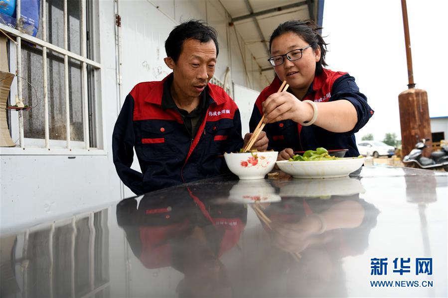 5月7日,邓伟(左)和妻子欧明艳在食用菌种植基地内吃午饭。 新华社记者刘军喜摄