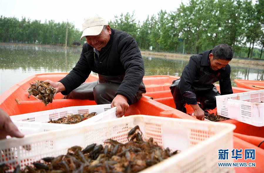 5月8日,沱湖乡大岗村村民在分拣养殖的小龙虾。近年来,安徽省蚌埠市五河县沱湖乡大力发展“虾稻共养”立体生态循环农业,通过“龙头企业+合作社”的形式,带动当地农民在稻田里进行水稻和小龙虾共养,助力农民增产增收。目前,沱湖乡共有5000亩稻田发展“稻虾共养”,6月起稻田里将陆续播种水稻,届时虾苗和水稻将在稻田里共生。新华社记者 刘军喜 摄