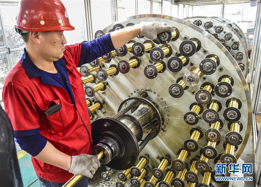 5月8日,河北景县一家石油机械企业工人为胶管缠绕机更换线轴。 近年来,河北景县着力实施创新驱动战略,鼓励引导企业转型升级,推动传统橡塑产业向高端化、绿色化、智能化迈进。 新华社记者 李晓果 摄