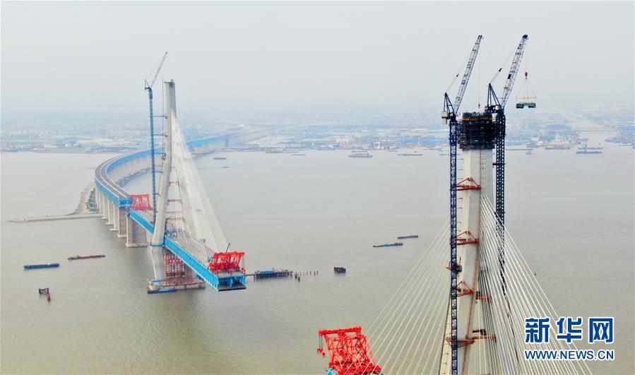 5月8日无人机拍摄的沪通长江大桥南主塔29号墩(右)施工现场。 据中铁大桥局沪通长江大桥项目部工作人员介绍,5月8日,由中铁大桥局承建的沪通长江大桥南主塔29号墩高度突破300米,达305.5米,预计7月封顶。 新华社发(许丛军 摄)