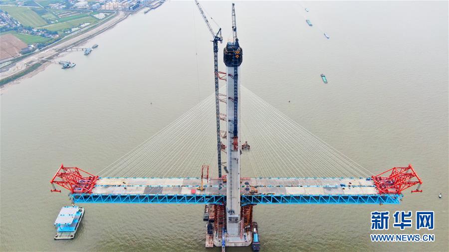 5月8日,中铁大桥局施工人员在沪通长江大桥南主塔29号墩进行钢锚梁吊装施工(无人机拍摄)。 据中铁大桥局沪通长江大桥项目部工作人员介绍,5月8日,由中铁大桥局承建的沪通长江大桥南主塔29号墩高度突破300米,达305.5米,预计7月封顶。 新华社发(许丛军 摄)
