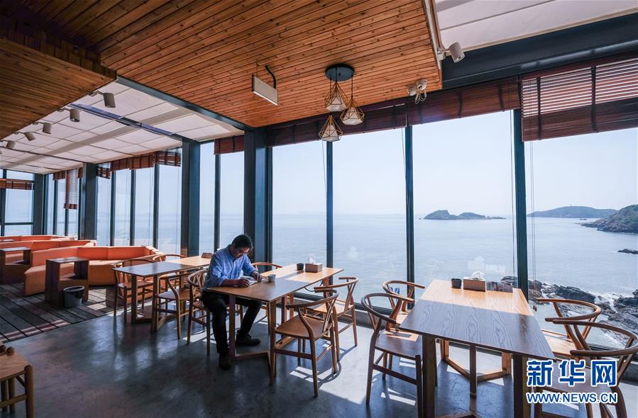 5月9日,游客在黄龙乡峙岙村一个临海而建的民宿餐厅内休憩,这个民宿由老旧仓库改建而成。 新华社记者 徐昱 摄