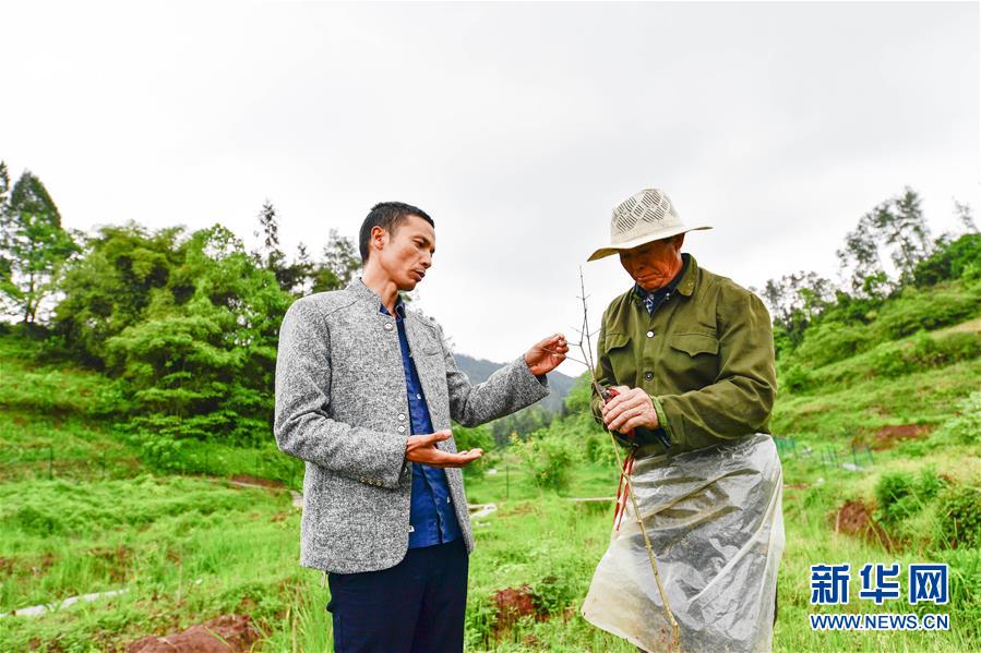5月8日,中毅金丝楠种植专业合作社的石榴种植基地内,“新农人”韦良中(左一)在对69岁的贫困户张忠伦(右一)进行科学剪枝现场培训。新华社记者 刘潺 摄