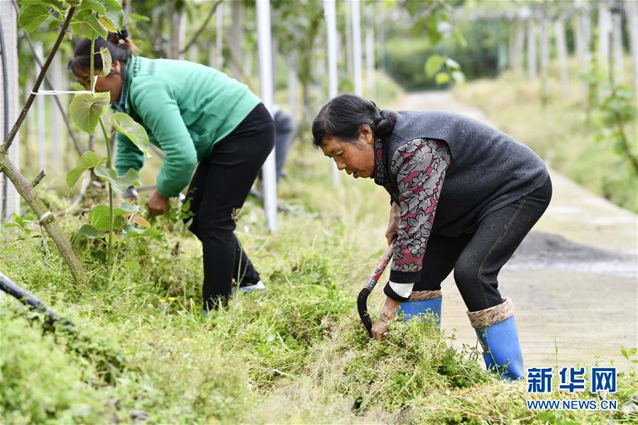 5月8日,长坪村村民在畔园猕猴桃股份合作社的猕猴桃种植大棚内进行除草作业。新华社记者 刘潺 摄