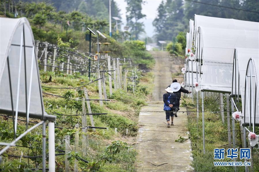 5月8日,在畔园猕猴桃股份合作社的种植基地内,劳作结束的长坪村村民沿着水泥便道回家。新华社记者 刘潺 摄