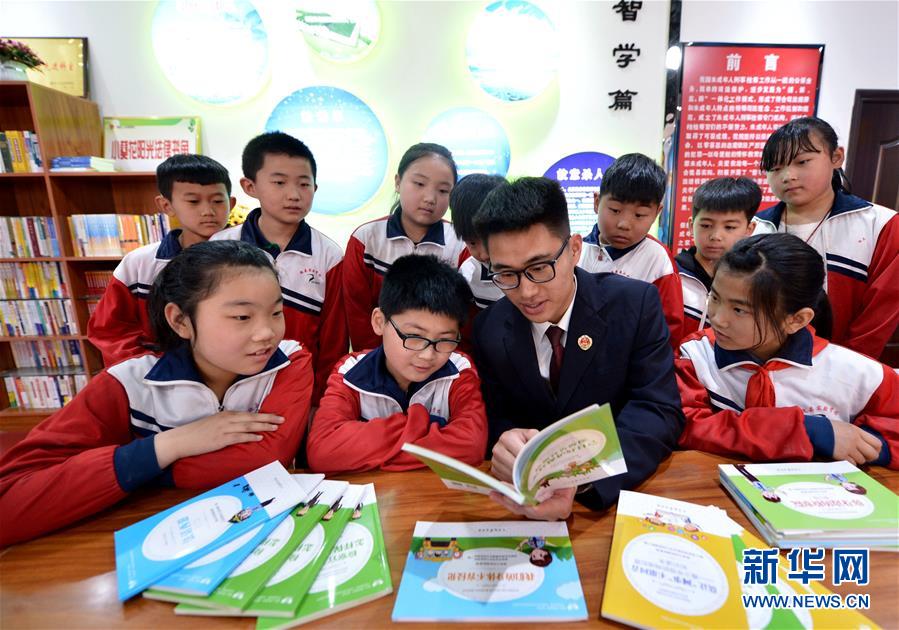 5月9日,河北省魏县的一名法律工作者(中)在为学生讲解法律知识。河北省魏县自2018年启动“小葵花阳光工程”,旨在打造集未成年人维权、犯罪预防、考察帮教工作三位一体的法制教育基地,面向全县开展未成年人法制宣传教育、心理咨询等工作,为未成年人健康成长创造良好的社会环境。新华社记者 王晓 摄