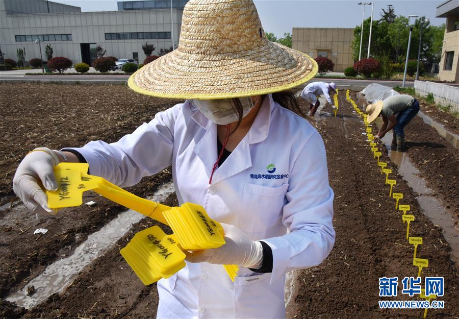 5月9日,青岛海水稻研究发展中心工作人员在工作。近日,青岛海水稻研究发展中心南繁种质资源材料春播育秧接近尾声,预计5月底第一批秧苗可开始移栽插秧试种。据介绍,今年该研发中心实验田将种植2000份水稻材料开展相关性状及抗性的调查和筛选,以考察不同种质资源的株型及性状表现,对表现稳定、品质优良的水稻材料进行审定,开展耐盐碱水稻推广前期试验工作。新华社记者 李紫恒 摄