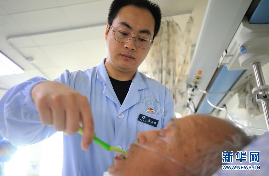 5月9日,湖南省衡阳市南华大学附属第一医院护士康石墙在给患者刷牙。新华社发(曹正平 摄)