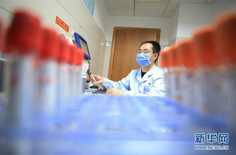 5月9日,湖南省衡阳市南华大学附属第一医院护士康石墙在给转院过来的患者做检查。新华社发(曹正平 摄)