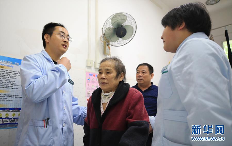5月9日,湖南省衡阳市南华大学附属第一医院护士康石墙(左一)下班后到康复科看望回访已经转到普通病房的患者。 新华社发(曹正平 摄)
