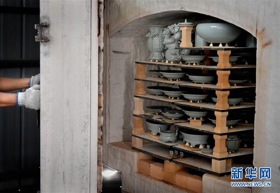 5月9日,王君子在河南省宝丰县大营镇清凉寺村的汝瓷作坊内开窑。 新华社记者 李安 摄