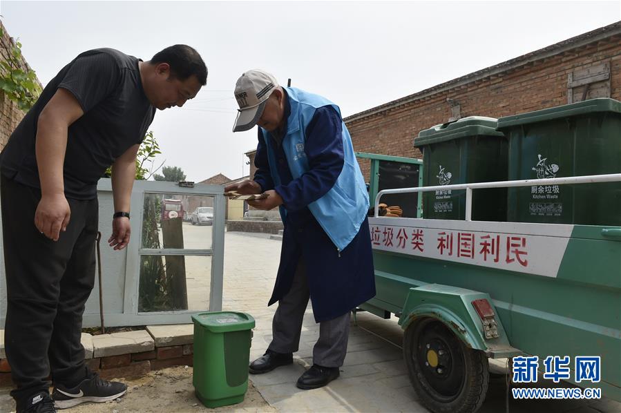 5月10日,在香河县蒋辛屯镇北李庄村,工作人员(右)在村民家门口上门回收厨余垃圾。该村村民家门前放置厨余垃圾桶,保洁员每天定期回收。垃圾桶上有二维码,保洁员通过扫描二维码记录每家产生餐余垃圾的重量,垃圾处理企业根据垃圾重量和分类情况进行评选,定期为表现优秀的村民发放生活用品作为奖励,鼓励村民从源头进行垃圾分类。2019年以来,河北省香河县大力推进农村垃圾分类和资源化利用,逐步完善垃圾分类、收集、转运、处理体系。目前,该县在实施安平镇、蒋辛屯镇等5个镇15个村街的农村垃圾分类试点建设同时,力争年底前完成农村垃圾分类全覆盖。新华社记者 鲁鹏 摄