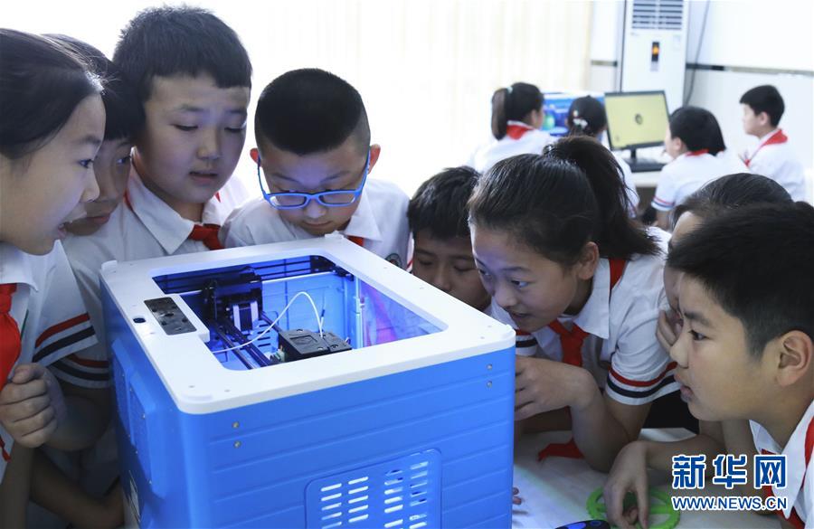 5月10日,河北省南和县第一小学的学生在体验3D打印。