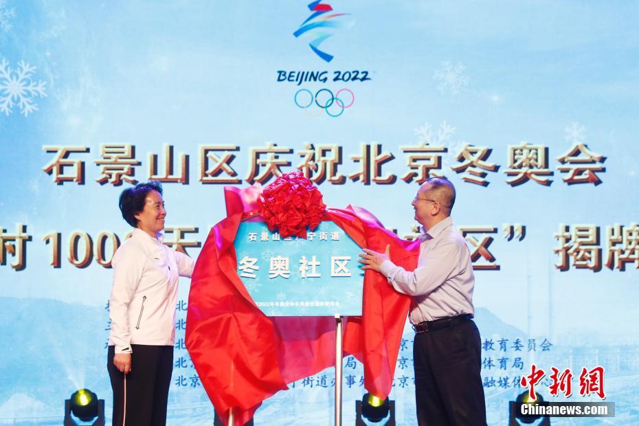 5月11日,北京石景山区广宁街道庆祝北京2022冬奥会倒计时1000天系列活动暨“冬奥社区”揭牌仪式在广宁街道高井路社区举行。高井路社区是北京第一个被授牌的“冬奥社区”。图为北京冬奥组委专职副主席、秘书长韩子荣,石景山区区委书记于长辉共同为“冬奥社区”揭牌。中新社记者 盛佳鹏 摄