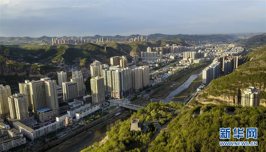 5月10日无人机拍摄的延安市嘉陵桥周围的城区和昔日烽火台(下中)。新华社记者 陶明 摄