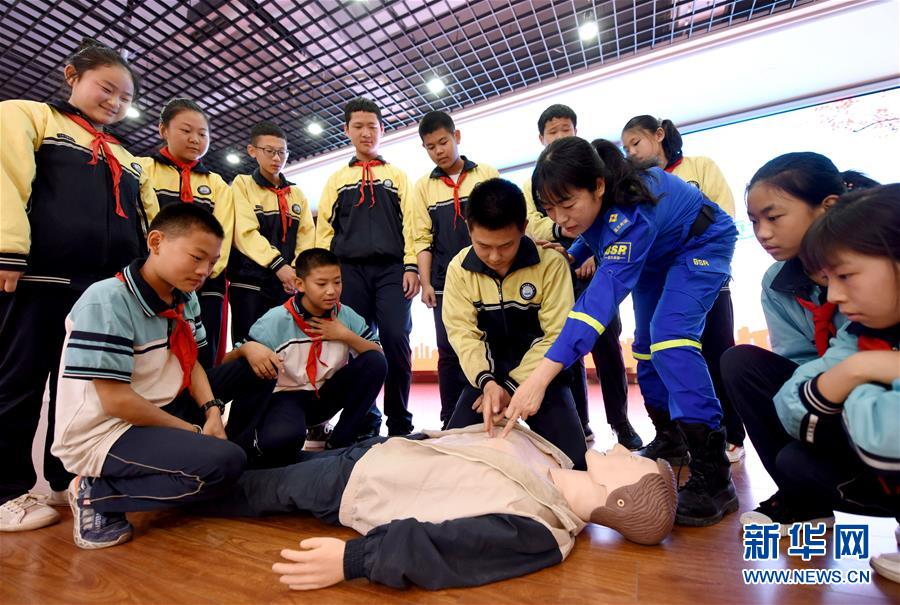 5月12日,邢台市第八中学学生在蓝天救援队队员的指导下学习心肺复苏急救技能。 新华社记者 朱旭东 摄