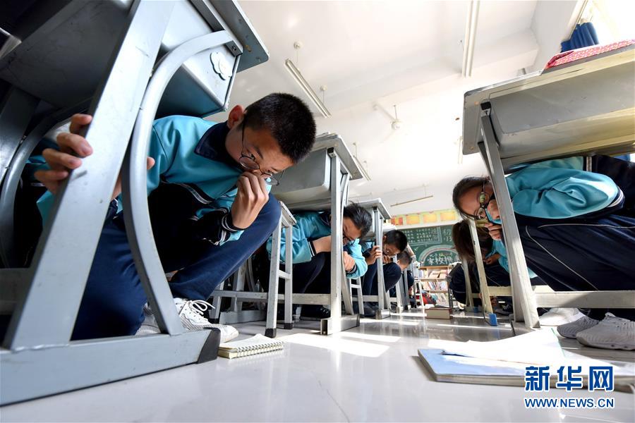 5月12日,邢台市第八中学学生在进行模拟防震减灾演练。新华社记者 朱旭东 摄
