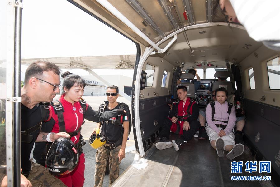 5月12日,在建德航空小镇驼峰跳伞基地,跳伞教练(左一 、左三)带着体验者登机。 随着气温升高,浙江建德航空小镇迎来大批体验高空跳伞的游客。自2017年7月启动华东地区首个高空跳伞基地以来,跳伞体验已成为小镇最热门的旅游项目之一,2018年共接待游客4000余人。 据介绍,近年来航空小镇旅游业态日渐丰富,主题乐园、高空跳伞、直升机低空游览、热气球观光等带火旅游经济。2019年至今,小镇接待游客42.7万人次、营收1511.7万元,分别比去年同期增长39.2%、43.5%。 新华社记者 翁忻旸 摄