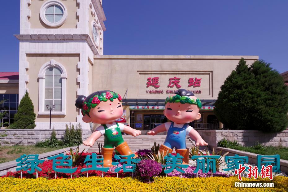 5月13日,北京市郊铁路S2线延庆站前,世园会吉祥物立在花坛中。该线路连接北京城区(黄土店站)和世园会主会场(延庆站)。世园会期间,S2线开行“世园会专线直通车”,全程只需82分钟。中新社记者 贾天勇 摄