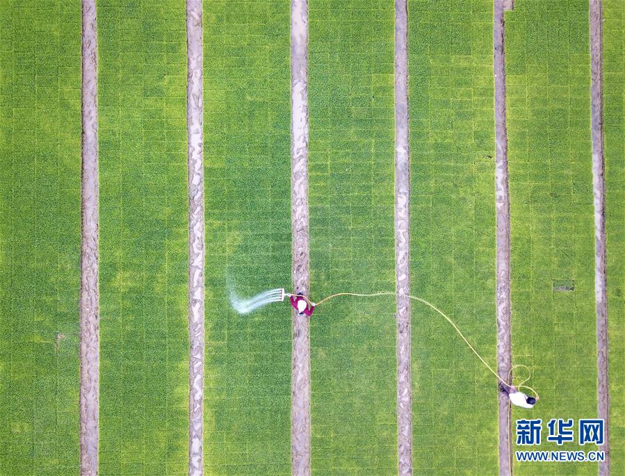 5月13日,全椒县六镇镇一家合作社的农民在水稻秧苗田里浇水(无人机拍摄)。 新华社记者 刘军喜 摄