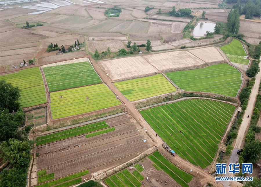 5月13日,全椒县六镇镇一家合作社的农民在水稻秧苗田里进行田间管理(无人机拍摄)。 新华社记者 刘军喜 摄