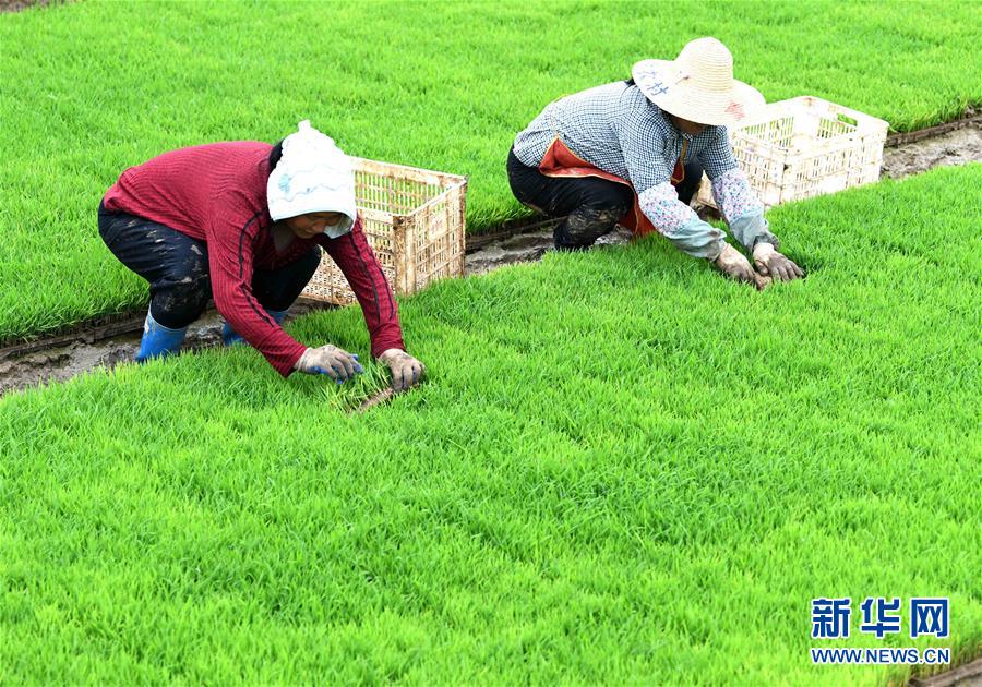 5月13日,全椒县六镇镇一家合作社的农民在水稻秧苗田里收获秧苗。 新华社记者 刘军喜 摄