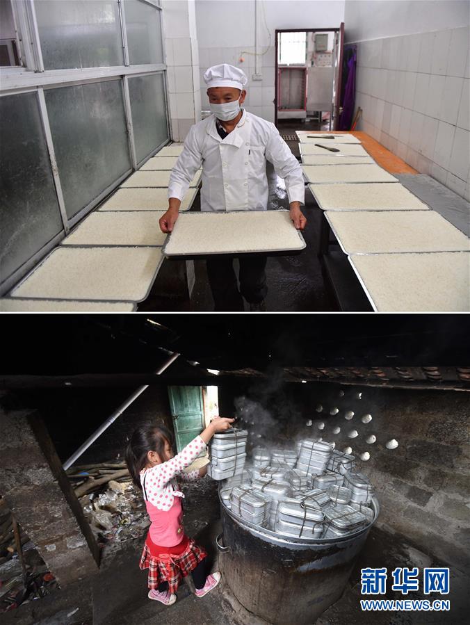 拼版照片:上图为在大化瑶族自治县板升乡八好小学,工人在食堂为学生准备营养午餐(2019年5月7日摄);下图为八好小学的学生将装好大米的饭盒放进锅里(2014年11月24日摄)。
