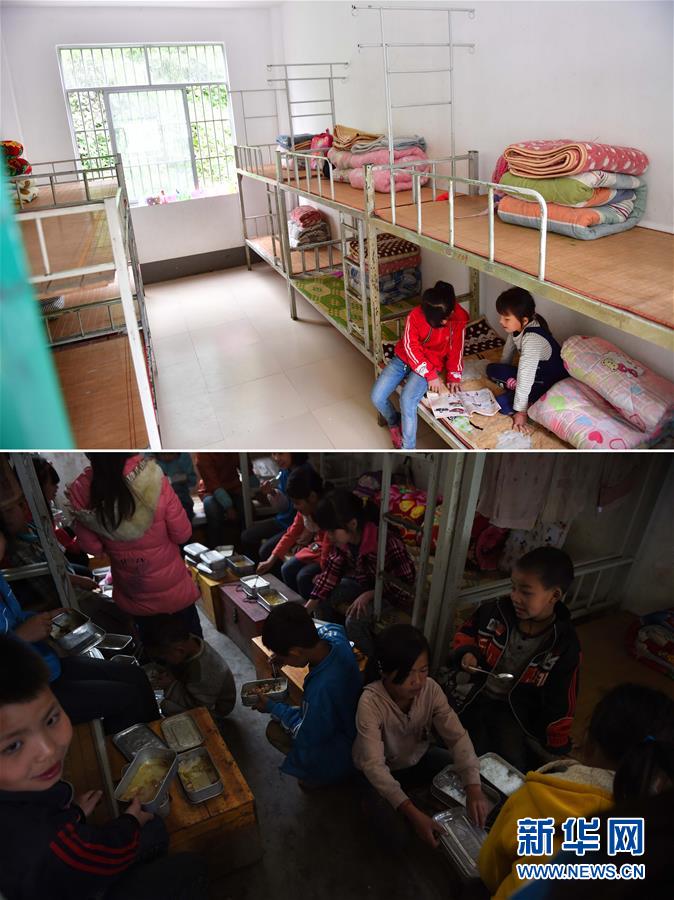 拼版照片:上图为在大化瑶族自治县七百弄乡弄呈小学,同学们在新宿舍里看书学习(2019年5月8日摄);下图为在弄呈小学,同学们在拥挤的宿舍里吃饭(2015年4月23日摄)。 新华社记者 黄孝邦 摄