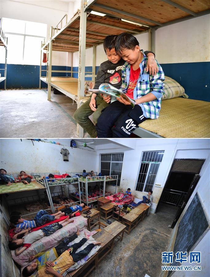拼版照片:上图为在大化瑶族自治县板升乡弄勇小学,同学们在宿舍里看书(2019年5月10日摄);下图为在弄勇小学,同学们在教室里睡觉(2014年7月1日摄)。新华社记者 黄孝邦 摄