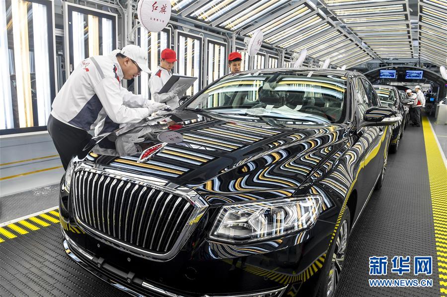 一汽红旗职工在总装车间内对生产的红旗轿车进行静检作业(4月9日摄)。 新华社记者 许畅 摄