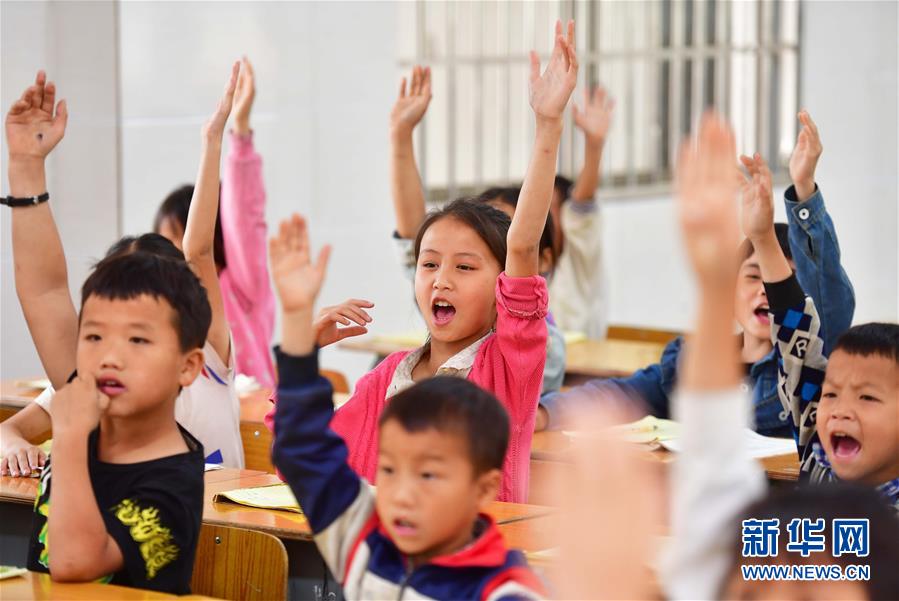 在大化瑶族自治县板升乡弄勇小学,同学们在课堂上举手回答问题(5月10日摄)。 新华社记者 黄孝邦 摄