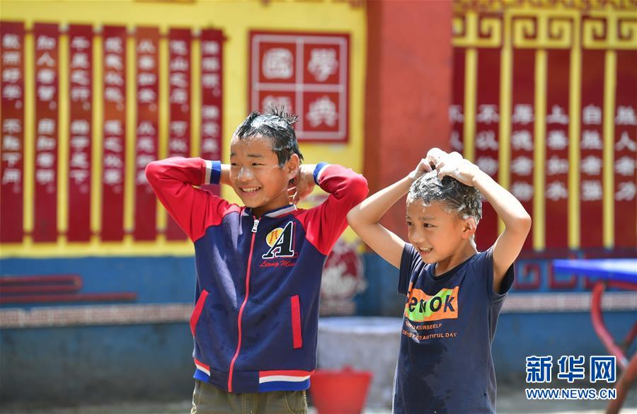 在大化瑶族自治县板升乡弄勇小学,两名男生在洗头(5月10日摄)。新华社记者 黄孝邦 摄